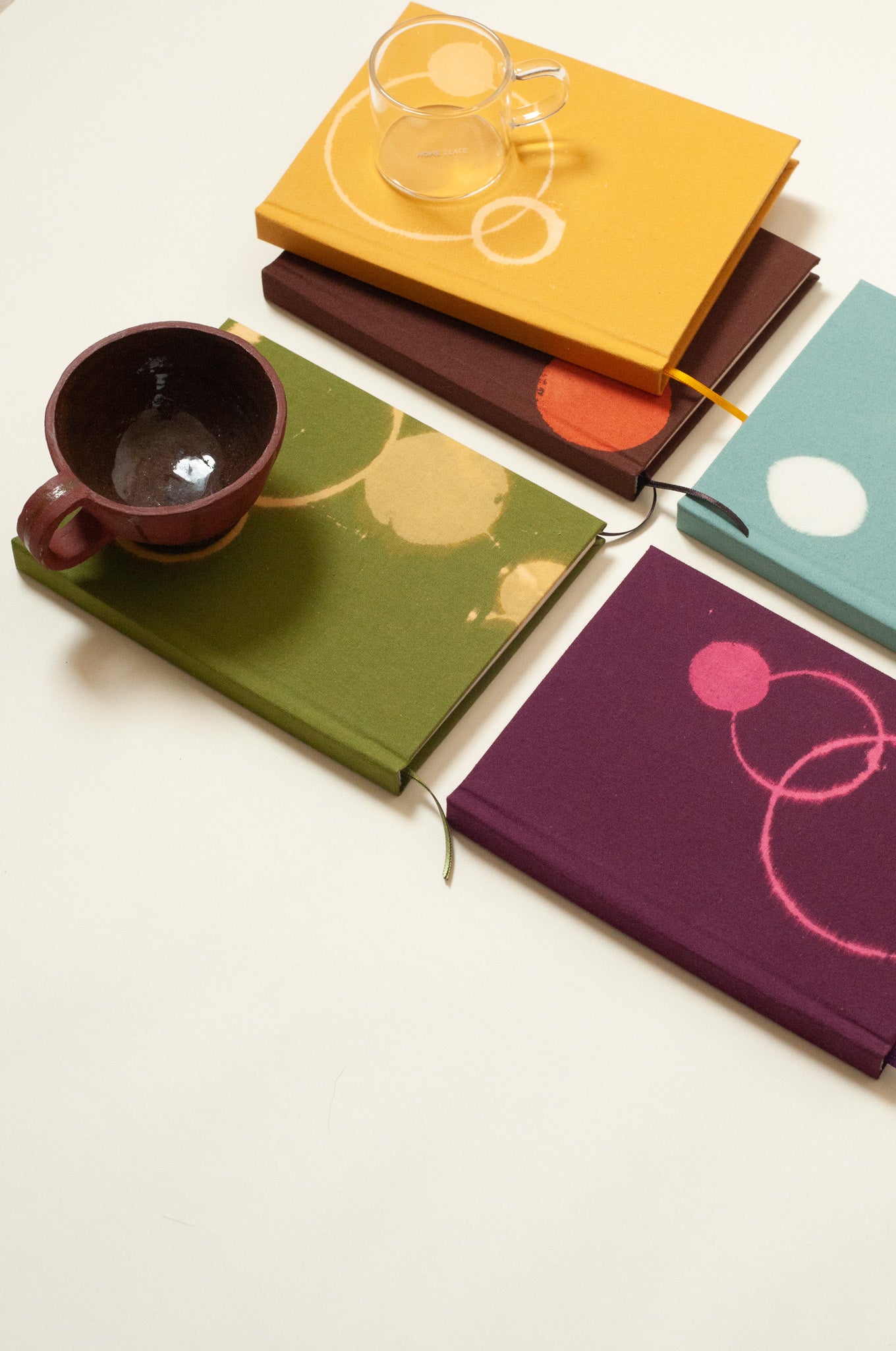 caderno artesanal com capa estampada manualmente em processo de carimbo com cloro utilizando fundos de copos e xicrinhas da cozinha de casa - é sempre uma peça única ✨